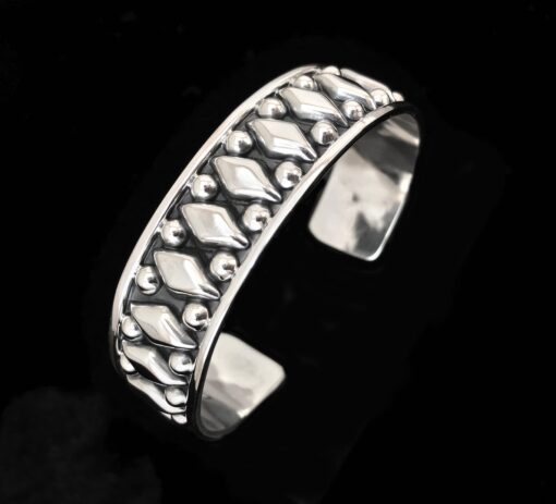 Sterling silver cuff bracelet with diamond-shaped half beads