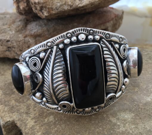 Sterling Silver Navajo Style Cuff bracelet featuring Onyx stones.  1 3/4″