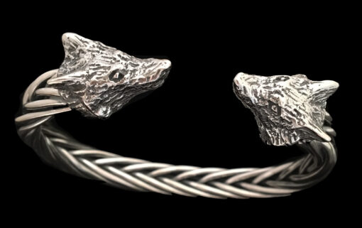 Sterling silver cuff bracelet with a wolf’s head and braided design